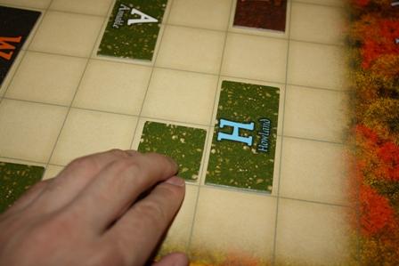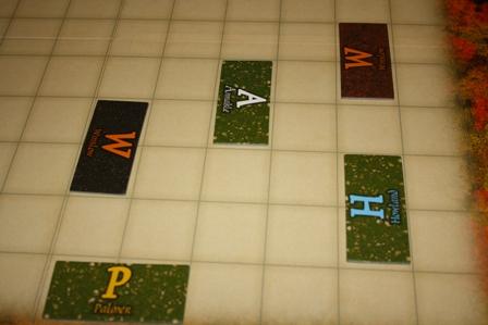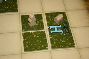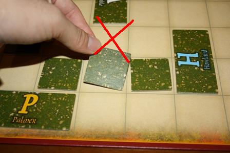 AだのHだのPだの書いてあるのは、プレイヤーを識別するためのもの。 んで、自分のスタートタイルから同じ色の土地タイルをくっつけるように置いていく。