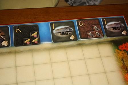 ただし、購入の順番は数字の大きなチップを取ったプレイヤーから 小さい数字を取ると、安く買える代わりに余りモノしか買えないというわけだ。 つまり、どうしても欲しいものがあるなら高く買いなさいということ。 ストックの土地タイルが尽きたらゲーム終了。 さて、最後に各コマの効能であるが、、