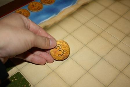 スタートプレイヤーから順番に、このチップを1枚ずつ取っていき チップに書かれている数字が購入金額になる。 たとえば、3のチップを取ればタイルでもカードでも1つにつき3金で買える。