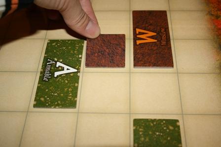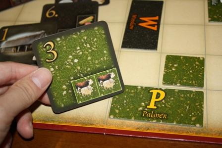 カードに描かれている土地と同じ種類、形のタイルを裏返すことができる。 たとえば、このカードなら2マス隣接している土地タイルを開発できるので・・ 裏返す。これで3勝利点。