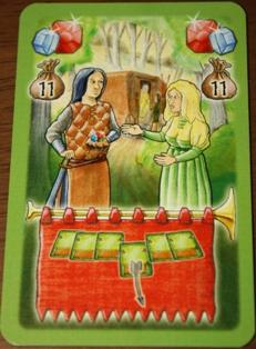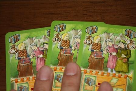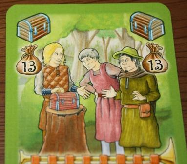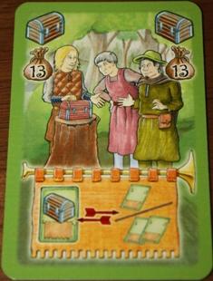 で、カードの両肩に書いてある数字が勝利点になる。 このカードなら13点。 勝利点を得たら、ボード上の黒いコマを1つ進める。