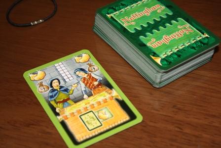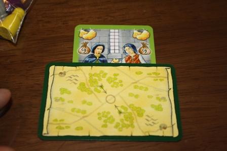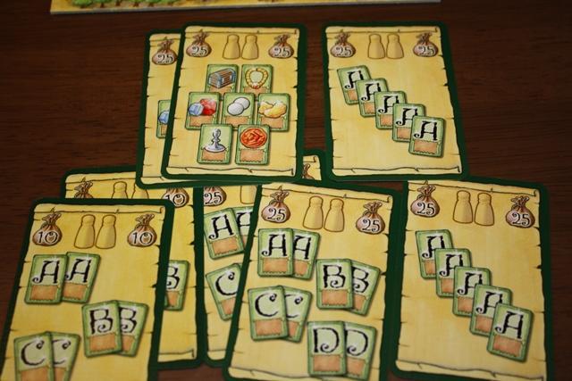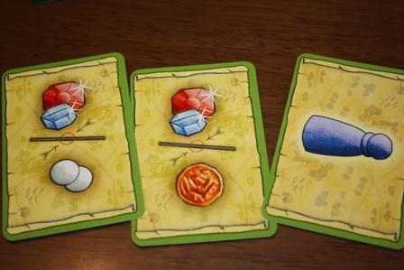 同じカードを2枚1組で3組揃えるとか4組揃えるとか。 全種類1枚ずつ揃えるとか。 そろえられたら、目標カードをもらえて これもやはり両肩に書いてある数字が勝利点になる。 ちなみに、この目標カード。全部2枚ずつあるので 同じ目標を2人までのプレイヤーが達成することができるのだが カードには表と裏があって