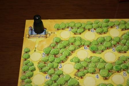 ボード全景。とてもスモールサイズなボードだ。この黒いコマがお城(ノッティンガム)からスタートして 1周して戻ってきたらゲーム終了。