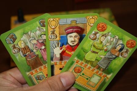 このとき、手札の枚数が進んだ先のマスに書いてある数字以下プレイヤー ※写真の場合は3なので3枚以下のプレイヤーは全員、カードを1枚もらえる。 →「執政官のお気に入り」というルール さて、勝利点を得るには3枚同じカードを揃えるだけではなくて 決まった組み合わせを揃えることで、もらうこともできる。 場には、こういう目標カードというのがオープンになっていて
