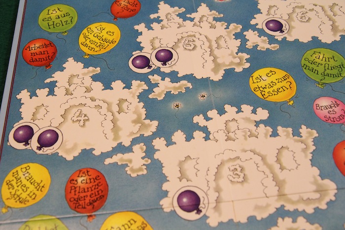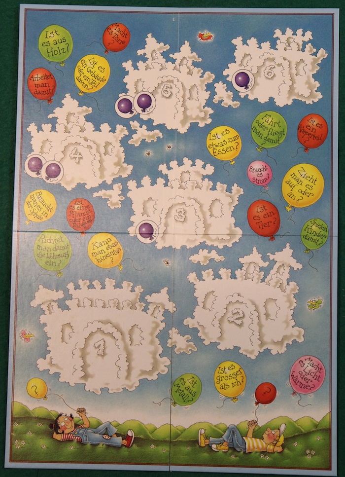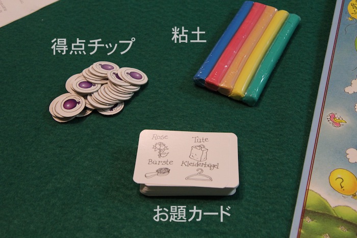 雲で出来たお城が6個描かれています。 ■やり方 ・粘土作品を作ったら、ボード左下の1の雲の上に置きます。 ・全プレイヤーが完成した粘土作品を置いたらゲームスタート (置く作品数はプレイ人数によって変化します) ーーーーーーーーーーーーーーー ・手番が来たら、正解が分かりそうな作品を1つ選んで 1つ上の雲のお城マスへ移動させます ・それを作った人に3回まで質問することができます ※ただし正解そのものをズバリ聞いてしまうような質問はNG。 あと答えはYES, NOで答えられるものでなければならないとかそのへんは本家と同じかな ・その後、それが何であるかを答えて、それを作った人はそれが正解かどうかを答えます ・正解なら2勝利点もらえます 数字が大きいお城のマスには勝利点マークが描かれていて