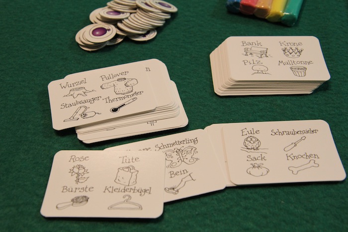 簡易版のバルバロッサです。 お題カードを引いて、カードに描かれているものを粘土で作って、それがなんなのかを当て合います。みごと正解できたら得点チップを2つもらえます。 ちなみにお題カードはこんな感じ。敢えて和訳しなくても絵でなんとなく分かるかな?