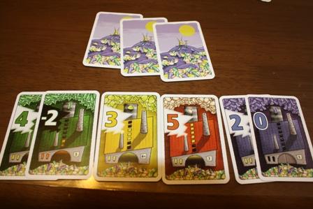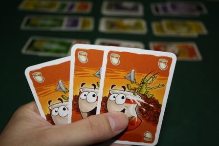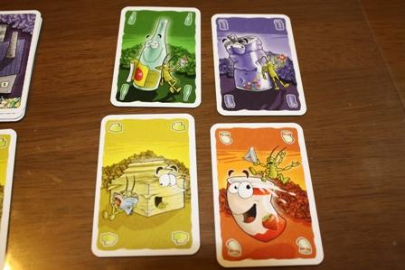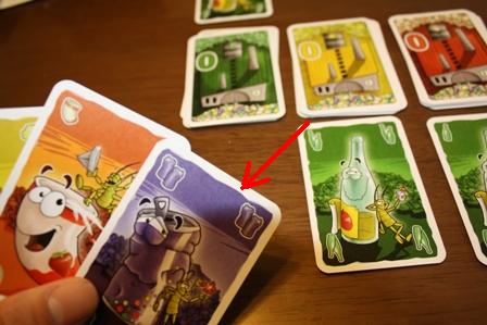 不法投棄したゴミカードは自分の前に伏せておきます。 不法投棄1枚につきマイナス1点。 得点カードの山のうちどれか1つがなくなったらゲーム終了。 取ったカードがこんな感じだった場合