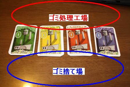 各カードの上側をゴミ処理工場、下側をゴミ捨て場と呼びます。 もう1つ、4種類のゴミカード。 これを工場で処理したり、不法投棄せざるを得なくなったりする。