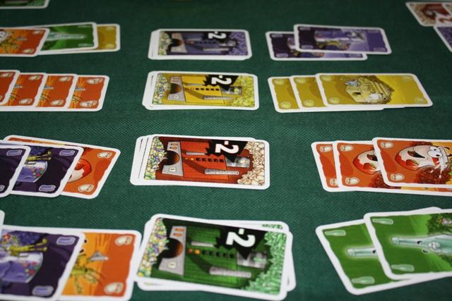 各プレイヤーはゴミ処理業者となって、不法投棄をしない優良業者を目指します。 得点カード。ゴミ処理工場です。同じ色を2枚以上集めると得点になる。 1枚だけでは0点。 実際プレイするときは、こんな感じでテーブルの中央にカード山にしておきます。