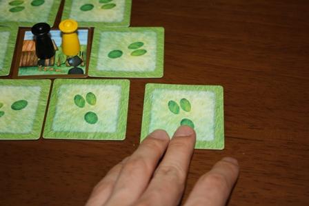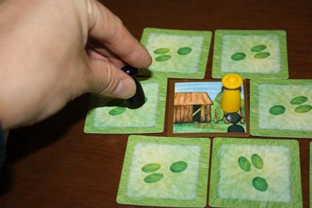 まわりに6枚、畑カードを伏せて並べます。 カードは写真のように互い違いになるように並べていく。 手番では、まず最初に手札から1枚選んで場に置きます。