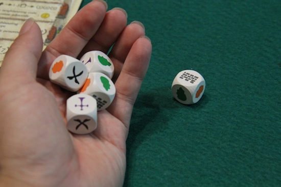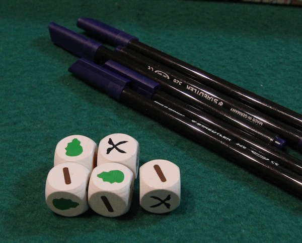 テーブルの真ん中に置きます そして、特殊ダイス5つと水性ペン