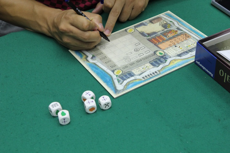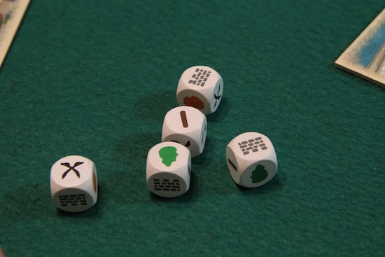 マスを建物や人物で全部埋めたら終了フラグが立ちます。 最も多くの勝利点を獲得したプレイヤーの勝ち **************** ダイスは5個いっぺんに振りますが 2回まで振り直しができます