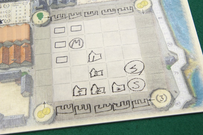 出た目の中から1種類を選びます。 この場合なら教会の目が4つ出たので、これを選んでみると 個人ボードには、建物や人を配置するための区画が描かれています