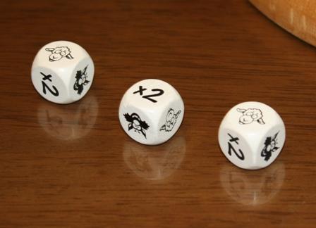 Aさん、相棒と3人プレイ 最初に3点ずつ持つのだが、そんなものはとうの昔に放出してしまい0点の俺。 もはや失うものは何も無い! いくぞ! コロロン・・・、羊コロロロン・・・、2倍