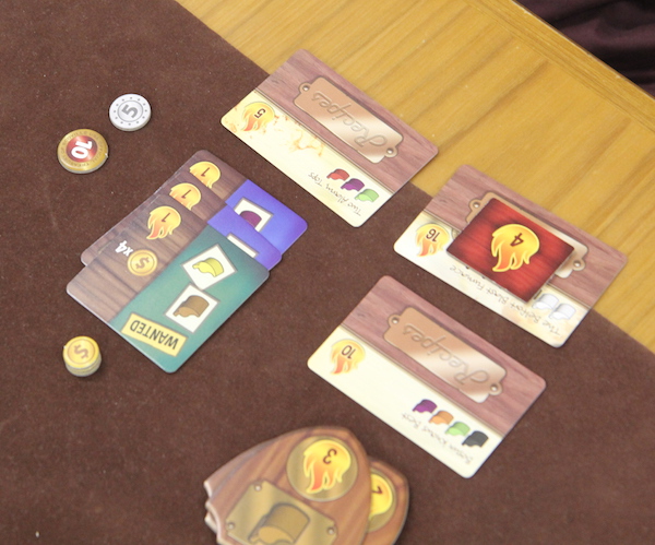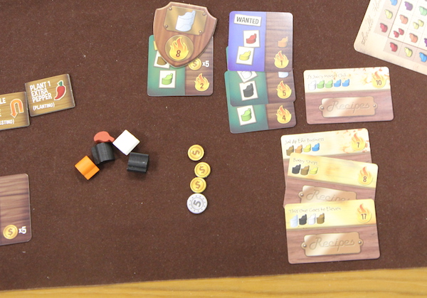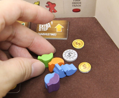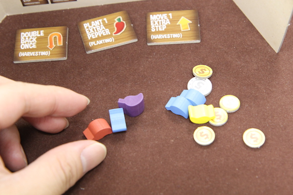 1人1枚選んで、カードに描かれているトウガラシコマをもらえます。 1ラウンドの構成は フェーズ1.トウガラシコマの支給 フェーズ2.トウガラシを1つ畑に植える フェーズ3.トウガラシを収穫する(農夫コマを3歩動かす) フェーズ4.得たトウガラシを支払って勝利点カードなどを買う となっていますが、各フェーズごとの手番順は競りで決定します。 各自、お金を握って一斉にオープン より多くのお金を握った人から順番に、各フェーズでの手番順を選んでいきます。