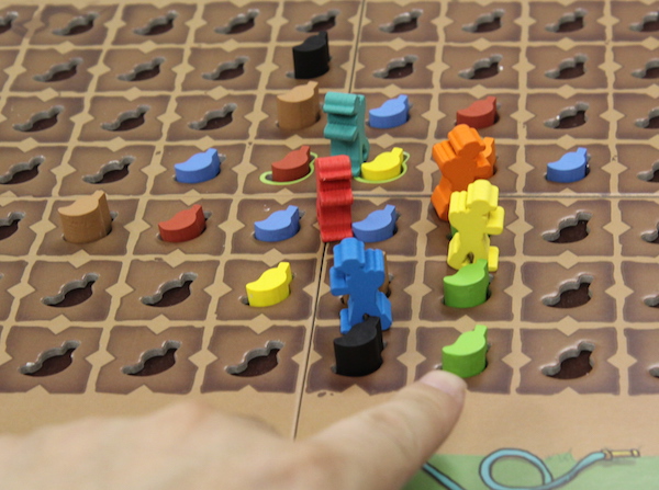 植えるフェーズが終わったら次に収穫フェーズなのだが、収穫の方法は自分の農夫コマを薄い茶色の道に沿って3歩まで動かします。 たとえば緑のコマを下記のように3歩動かしたとすると 青と黄色で緑、赤とオレンジで茶色、オレンジと青で茶色、合計3つのトウガラシを獲得できます。