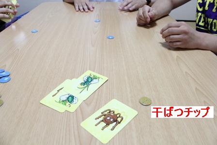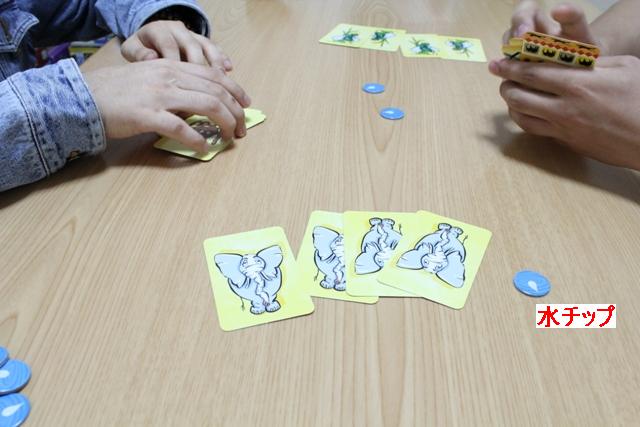 ロクな写真が撮れなかったので、その点まずはご勘弁ください。 色々な動物が描かれたカードをよく切って全員に配ります。で、掛け声の合図で全員一斉に、手札から1枚選んで左隣の人に渡します。 手札から1枚選んでは、隣に渡してというのを繰り返して 写真のように、手札が全て同じ動物になったら 「水!」と大きな声で言います。 この掛け声がかかったら、テーブル中央に置かれた「水チップ」を 早いもの勝ちで取ります。 水チップはプレイ人数-1 つまり、誰かは取ることができない 水チップが取れなかったプレイヤーは、「干ばつチップ」を受け取ります。