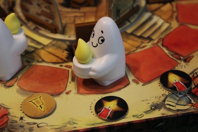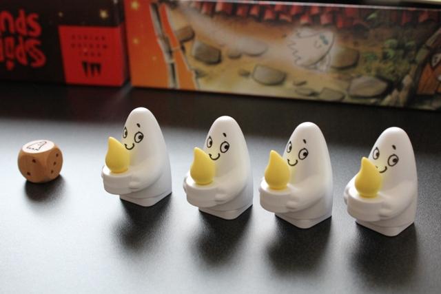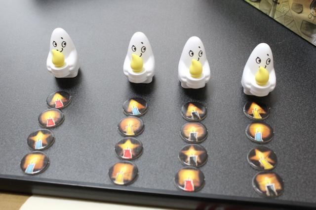 ロウソクチップは、マスの外側にランダムに伏せて置きます。 手番では、サイコロを振って出た目の数だけ任意のオバケを動かします。