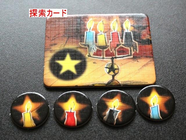 プレイヤーは最初に1枚ずつ「探索カード」を受け取って、そこに描かれているのと おなじシンボルマークのチップを集めます。