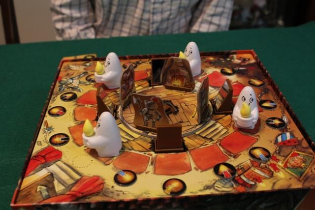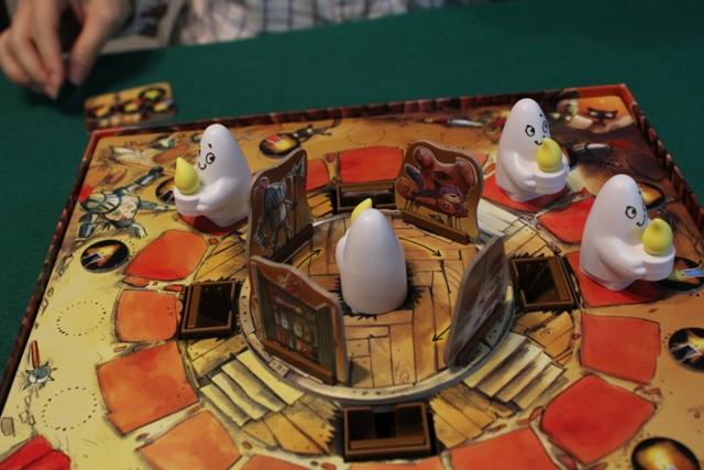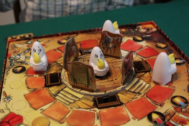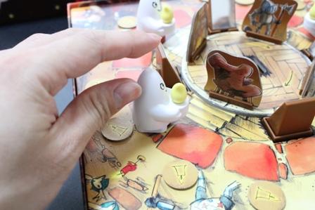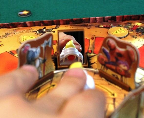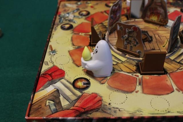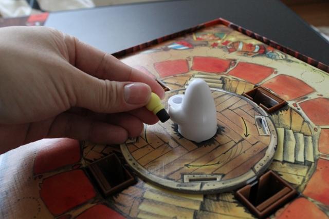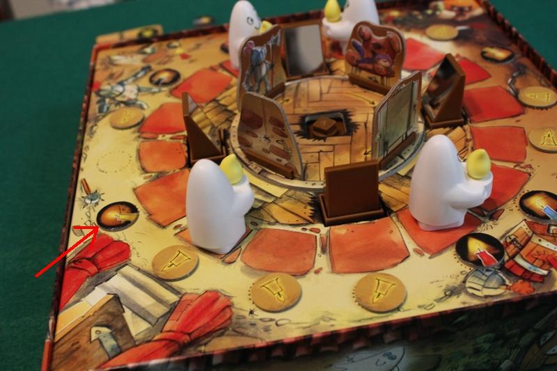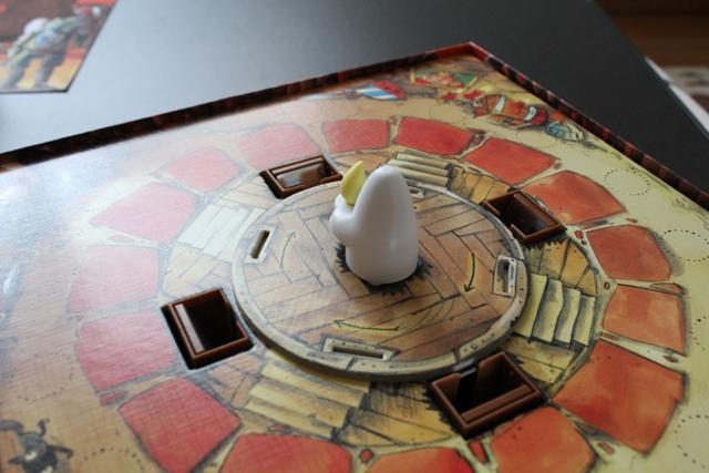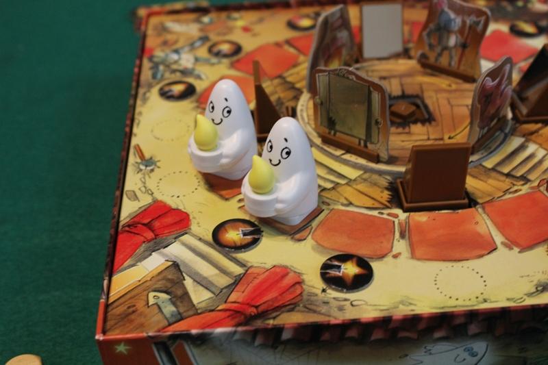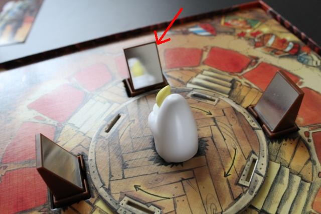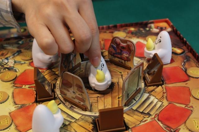 4つそろったらすぐに告発することができます。 4つのオバケコマはボード上の赤いマスの上を動きます 中央の回転台には目隠しのための障害物が立てれていて 真ん中にオバケコマを置いて回すと、これらの障害物も一緒に回ります。