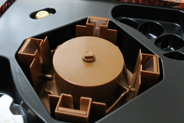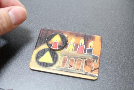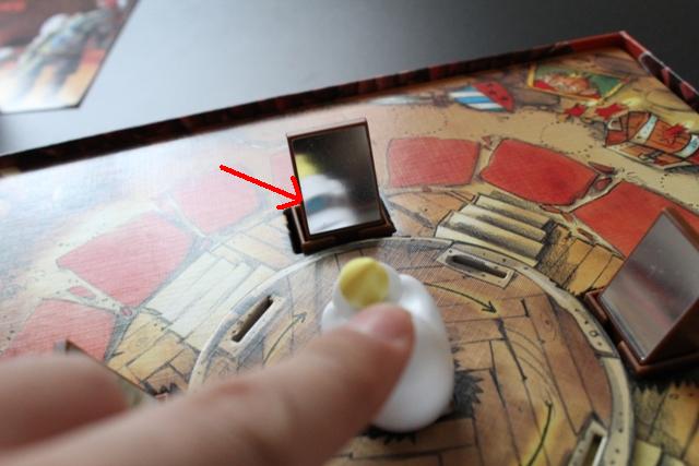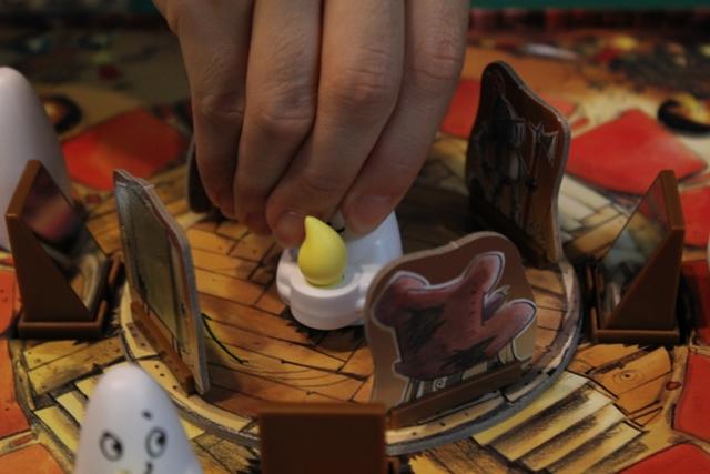 この場合は「赤」ですね。ちょっと写真が分かりづらいのだが・・ ※雲って見えるのは保護フィルムをはがし忘れていたからで、フィルムをはがせば綺麗に映ります 4つのチップをそろえることができたら、すぐに本物のオバケの告発にチャレンジできます。 本物のオバケだと思うコマを取って、真ん中に置いてクルッとまわします。 で、鏡が落ちたらオバケが持っているロウソクの色を当てにいきます。 ここで、鏡が落ちなかったり、色を言い当てられなかった場合は 集めたロウソクチップをすべて場に戻さなければならない。 ちなみに、ボードを外してみると中はこうなっていて