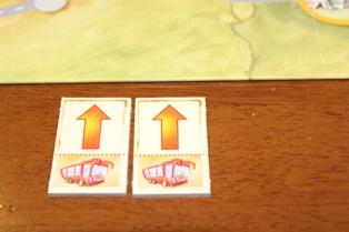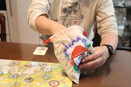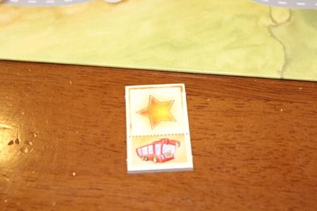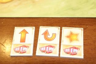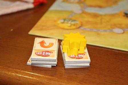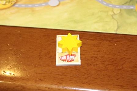 バスを動かすのは手番プレイヤーなので、基本的に手番の人が有利なのだが もし、自分の目的地に行く途中で他のプレイヤーの目的地を踏んでしまったら チップはそのプレイヤーが獲得して手番終了になります。 スタートークンもチップを獲得した(目的地に着いた)プレイヤーが同時に獲得します。 スタートークンが全部で5つ出たらゲーム終了 チップとスタートークンを重ねて、一番高い人の勝ち
