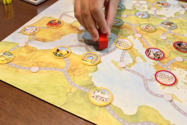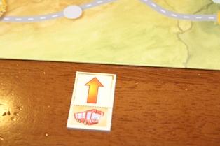 進むマス数は、チップの数なのでこの場合は3マス。 手番が進むたびにどんどんチップは増え、一気に進むマス数も多くなります。 誰の手番中であっても、バスが自分の目的地に着いたら