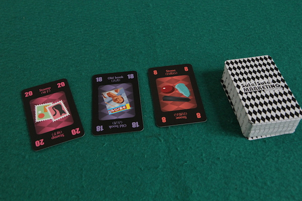 捨て札にされた同じカードは纏めておきます 山札が無くなったらゲーム終了 カードの種類ごとに 1.最も多くの枚数を手札に持っているプレイヤーは、捨て札にされた同じカードの枚数と同じ得点をもらう 2.2番目に多くの枚数を手札に持っているプレイヤーは、1位のプレイヤーが持っている枚数と同じ得点をもらう たとえば、切手(20枚)の内訳が 捨て札:8枚 1位のプレイヤー:11枚 2位のプレイヤー:1枚 だったとすると 1位:8点 2位:11点 となります 静かなブームカードを捨てることにした場合は、任意の種類のカードの枚数を増やすことができます。
