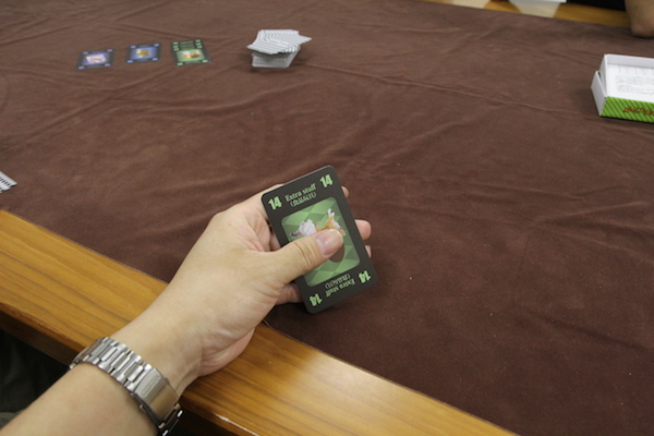 BかAか、けっこう悩んだのだけれど・・ カードの種類ごとに、手持ちの枚数で1位のプレイヤーが場に出てるカードの枚数と同じ得点を獲得するってとこまでは 割とありそうなルールだけれども、2位が1位のカード枚数と同じ得点をもらえるってのが良いですね。 ちょっと王と枢機卿を彷彿とさせるものがありました。 でも、1位よりも2位が高得点になることもあるというのは王と枢機卿には無い面白いところだと思う。 実際やってみると、そうそうそんなことにはならなかったけれども。 ライバルがどの程度の枚数を確保してるのか?という読み合いがすごい熱い! これは盛り上がりますね。 あと、カードの枚数が点数になるので その種類のカードについて 1位は場からその種類のカードを総取り 2位は1位から手札のカードもらう 3位以下は手札から捨てる という風にすれば、手元に残ったカードの枚数=得点になるのも非常にスムーズにゲームが進行して良い感じ。 通常、こういう種類ごとに点数が発生するタイプのゲームだと得点チップか筆記用具が必要になることが多いと思うけれど そういうのが一切不要というのがすごくいい。 セットアップも楽チンそのものだし、最高レベルのプレイアビリティ。 あと、7人プレイでも全然いけますね。 ルールブックに書かれているプレイ人数の場合だと、必ずカードを全部使い切って終わるようになってるので それなら7人の場合は、初期手札1枚ずつで、場に3枚オープンにすれば良いと思う。 カードの出来も素晴らしいし、このまま流通しなくなってしまうというのは非常にもったいないなぁ、と思いました。 コンポーネントも含めて、これは完成度かなり高いと思いますよ〜 2014/07/01ツイート