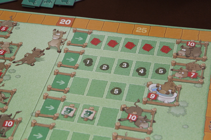 ニムトのボードゲームバージョンです。 ここでは「違い」という視点で紹介してみようと思うので、知らないという方は先にニムトのページを参照して下さい。 ボード全景、本作ではカードの代わりにタイルを使用します。 で、そのタイルをボード上に置いていきます。ボードの外周には得点チャートが描かれていますが、ニムトと同じくこれは失点を表します。 タイルのバック