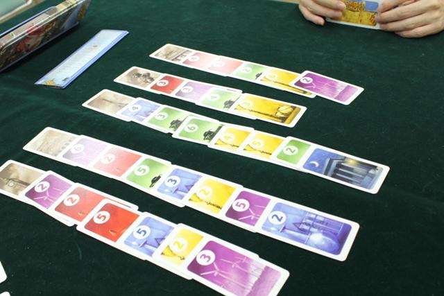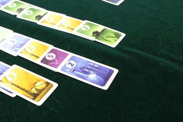 カードゲームです スートは5種類(赤、黄、緑、青、紫)で数字は2~6まであります。 それをこんな感じで、カードを少しずつずらしながら5列に並べます。手番では、カードを1枚買うことが出来ます。 購入金額は、カードに書かれている数字と同じ。