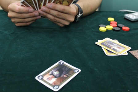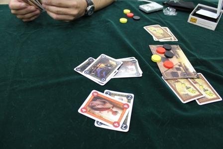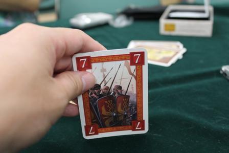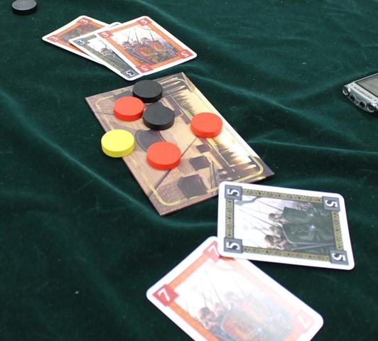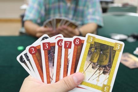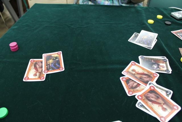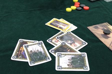 で、チップが3つ置かれたスートのカードのうち 3,5,7だけが得点になる 写真の例でいうと、3枚取られたチップは赤。 で、手前のプレイヤーが赤の7。 奥のプレイヤーが赤の3と5を仕込んでいたので 7対8で奥のプレイヤーの勝ちとなる。 こんなところかな。