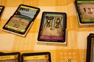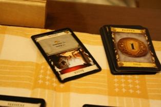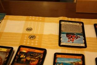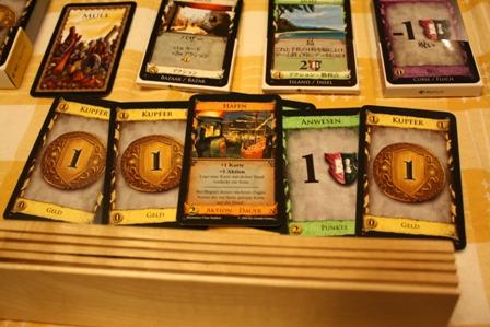 相棒と2人プレイ。 適当に面白そうなアクションカードを10種類セレクトしてみた。「海賊船」と「島」が入っているので、例の金属製のコインと マットも用意する。 さて、最初の配牌。銅貨は3枚だ。
