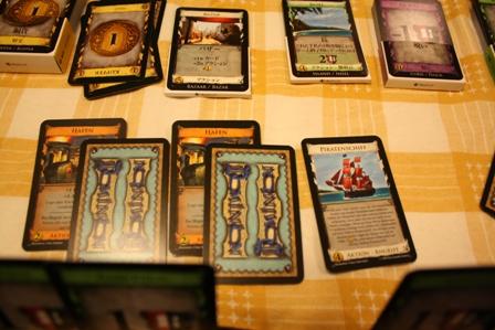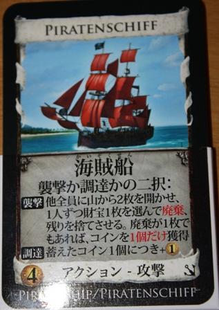 相棒の財宝カードを廃棄させつつ、コインの獲得に成功する。 財宝カードが少ない場合は、停泊所でそのわずかな財宝カードをキープして 次回に持ち越したほうが良さそうだ。だんだん使い方が分かってきたぞ。 それを見て、相棒も海賊船をやりだす・・・