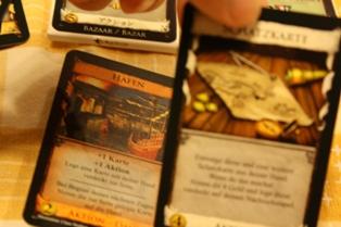 ================================ ■バザー...価格5 +カード1枚 +2回アクション +1仮想コイン ================================ この内容、ドミニオンにあった「村」とそっくりだ。 使い勝手が良さそうなのだが、いかんせん値段が高いなぁ。 次のターン、面白そうなので例の「海賊船」を買ってみる。