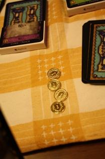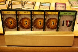 手札の1枚と一緒に2枚セットで、島マットの上に置いておけるアクションカードだ。 最後の得点計算のときデッキに戻せるので、ゲーム中は単なるお邪魔カードでしかない 勝利点カードを手札の循環から外しつつ、確保しておくことができる。 もう1つ、新しいコンポーネントのトークン(左)とコイン(右)。