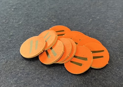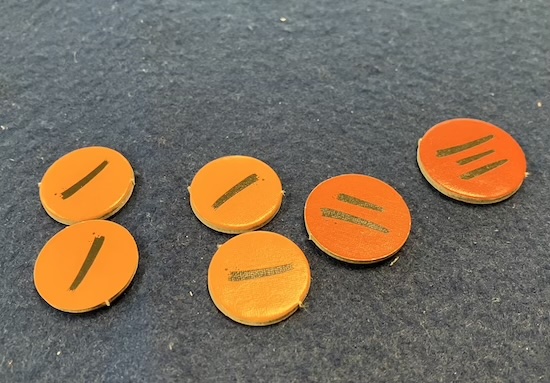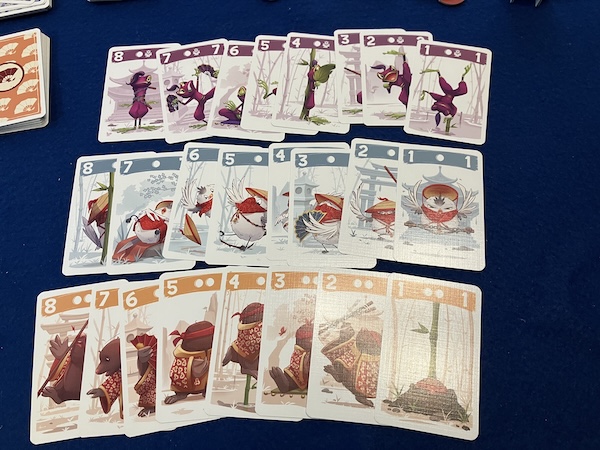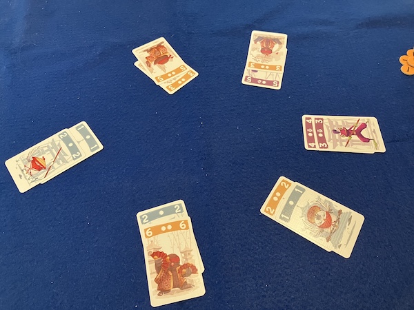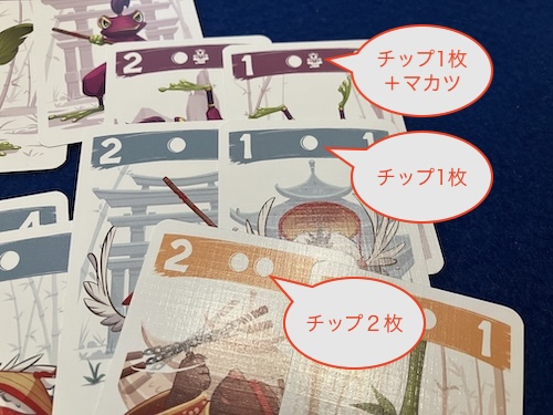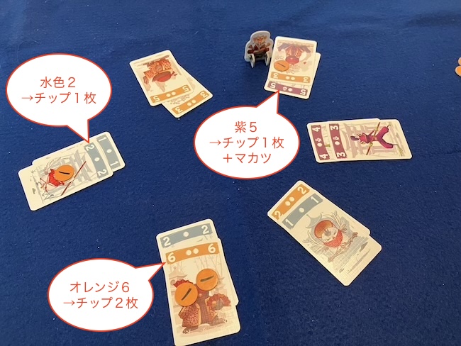 各スートで一番大きい数字を出したプレイヤーはマイナスチップを受け取ります。 (水色は1枚、オレンジは2枚、紫は1枚とマカツコマを受け取ります)