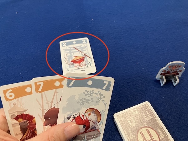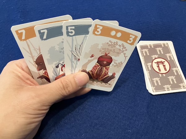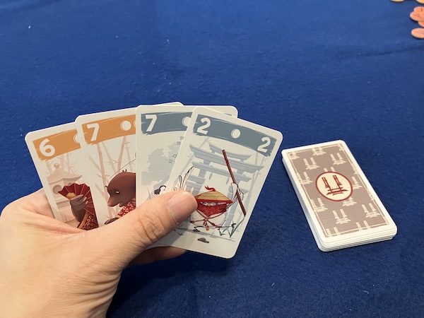 数字が同じ場合は、後から出したプレイヤーがマイナスチップを受け取ります。 場に出されたカードは全て捨て札にします。 これをデッキが無くなるまで続けます。 (24枚で4枚ずつ引くので6回やります) 伏せておいたカードが12枚あるはずなので、これを良くシャッフルして新しいデッキにします。 4枚引いて同じように手札にします。